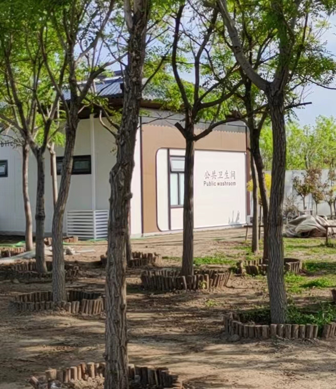 本項目位于天津市中新生態城媽祖文化園內東南角綠化帶處。該建筑為箱體組合裝配式公共衛生間,占地面積87.6平方米,廁所基礎為150mm厚C20砼墊層,200mm厚C30鋼筋混凝土墊層。