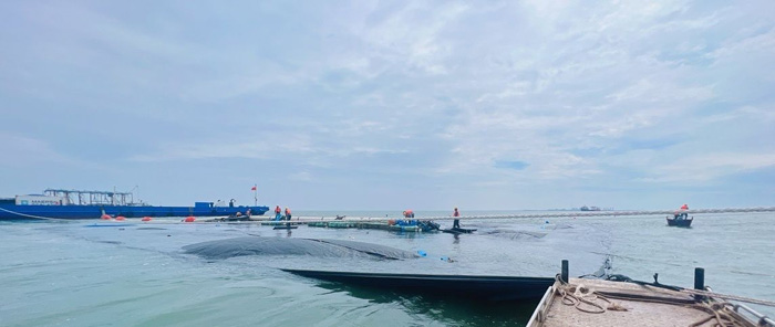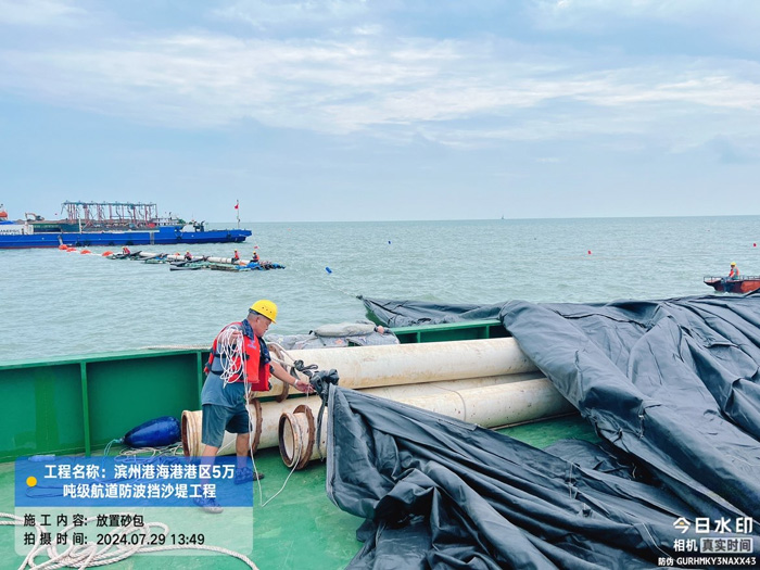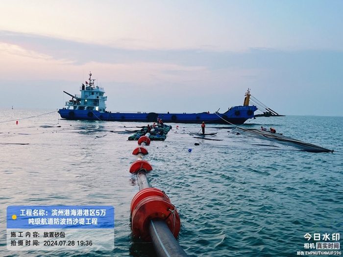 本工程位于山東省濱州市無棣縣濱州港區(qū),擬建的水工建筑物主要包括新建東西兩條防波擋砂堤,單堤長度8800m,總長17.6km。我司主要參建內(nèi)容:負(fù)責(zé)東堤1800米砂被吹填、土工布及土工格柵施工,里程為K2+200~K4+000。